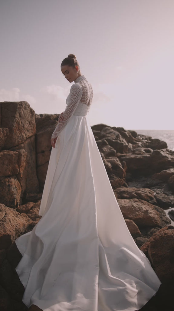 The flowing skirt introduces soft movement and sophistication, while the daring thigh-slit adds a touch of allure and confidence - perfect for brides who want timeless simplicity with a fashion-forward edge. Every element of Alya is thoughtfully balanced to deliver a look that is graceful, memorable, and strikingly modern from ceremony to first dance.