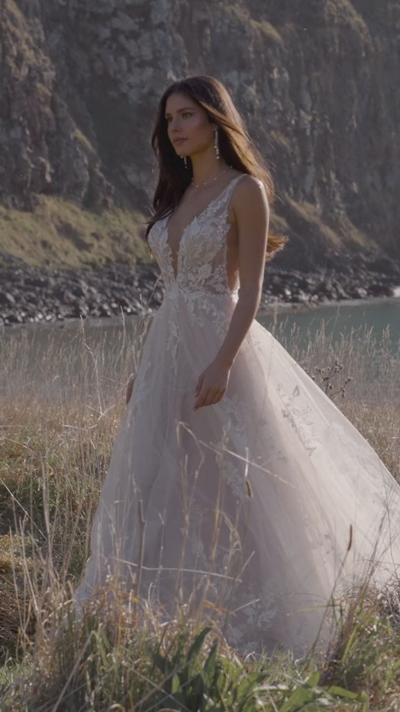 Kara by Madi Lane - Romantic Lace A-Line Wedding Dress with Plunging V-Neckline and Illusion Back