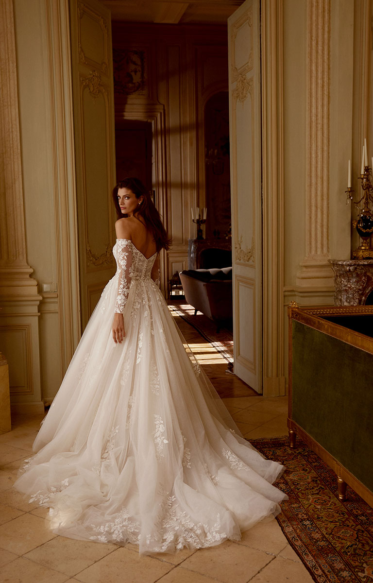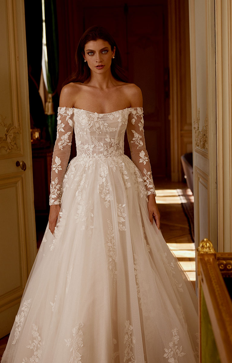 Straight off-the-shoulder neckline with long sleeves for a romantic, elegant style