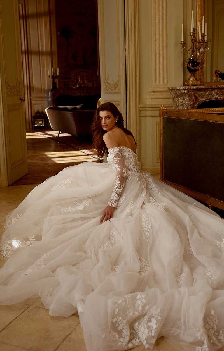 Janelle is designed for the bride who wants to shine with sophistication, combining a timeless ball gown silhouette with modern details and sparkling lace.